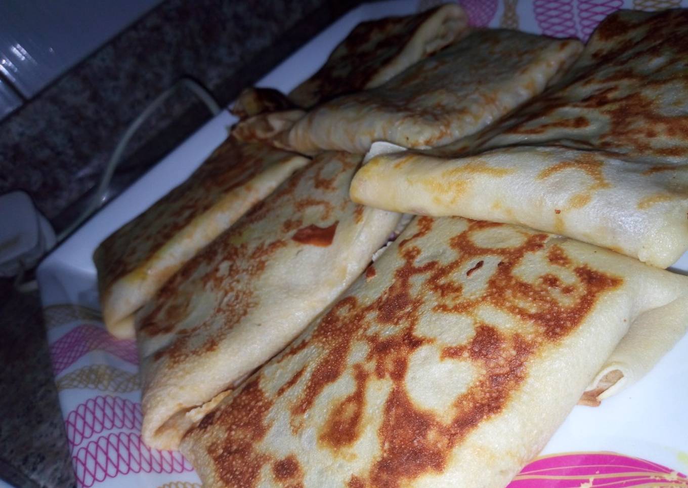 - Fry your pancakes,and then place on a plate and then add the meat, either by the side or at the center,I placed mine at the center, then wrap as you want.