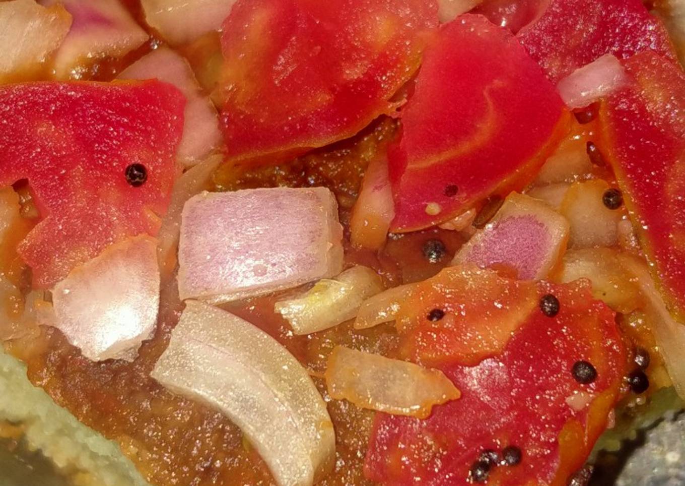 - When it's cooked take a plate serve it in plate. For presentation. Spread tomato sauce add onions tomato green coriander leaves and salt. Red chili spread it and cuts in to small pieces serve with chutney.