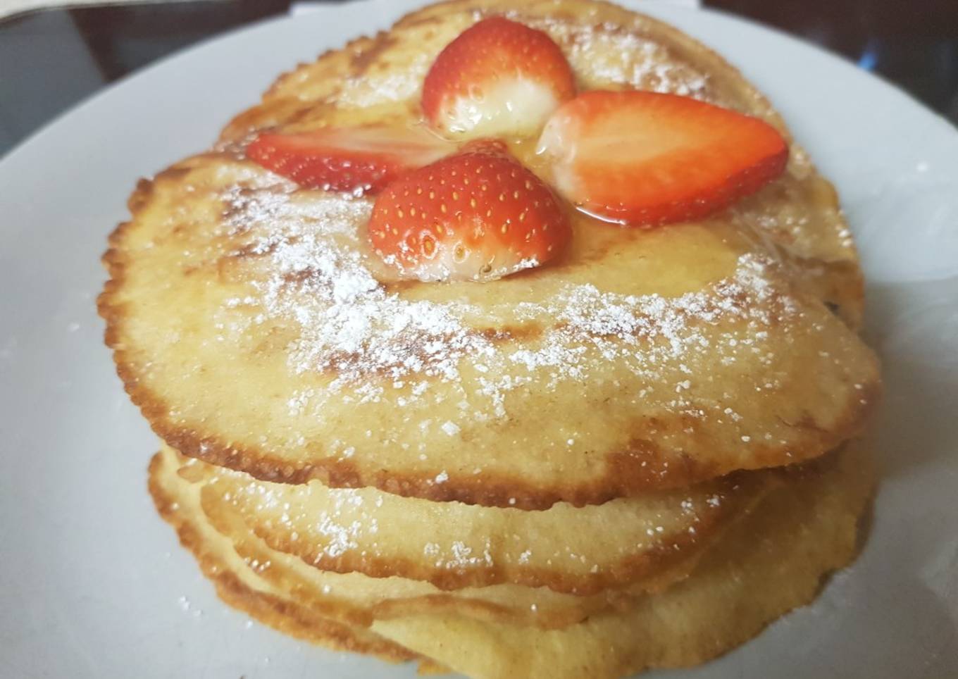 - Turn over 1 more time then add to a servig plate and add another. Add a few strawberries on the first pancake on the serving plate. Then do the same until all pancakes are done. I got 6 stacked pancakes and Strawberries out of that amount. On the last layer add a little sieved icing sugar then add the last pancake