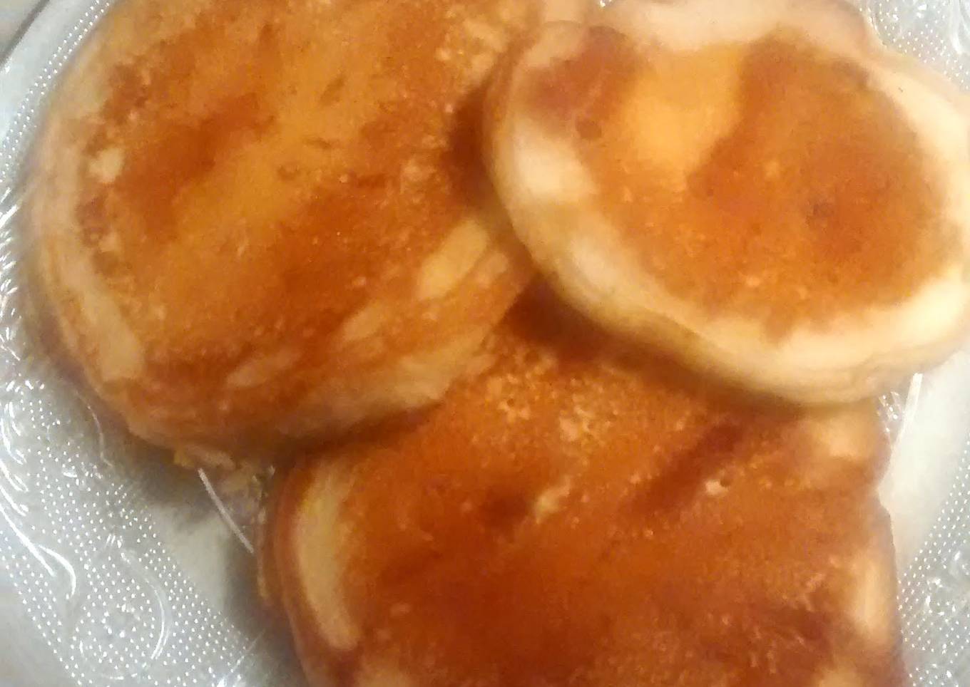 - Use a 1/2 cup to pour the pancake mix into the hot pan with the melted butter. Insert a toothpick into the pancake, if it comes out clean its already fully cooked. You will get 5 pancakes.