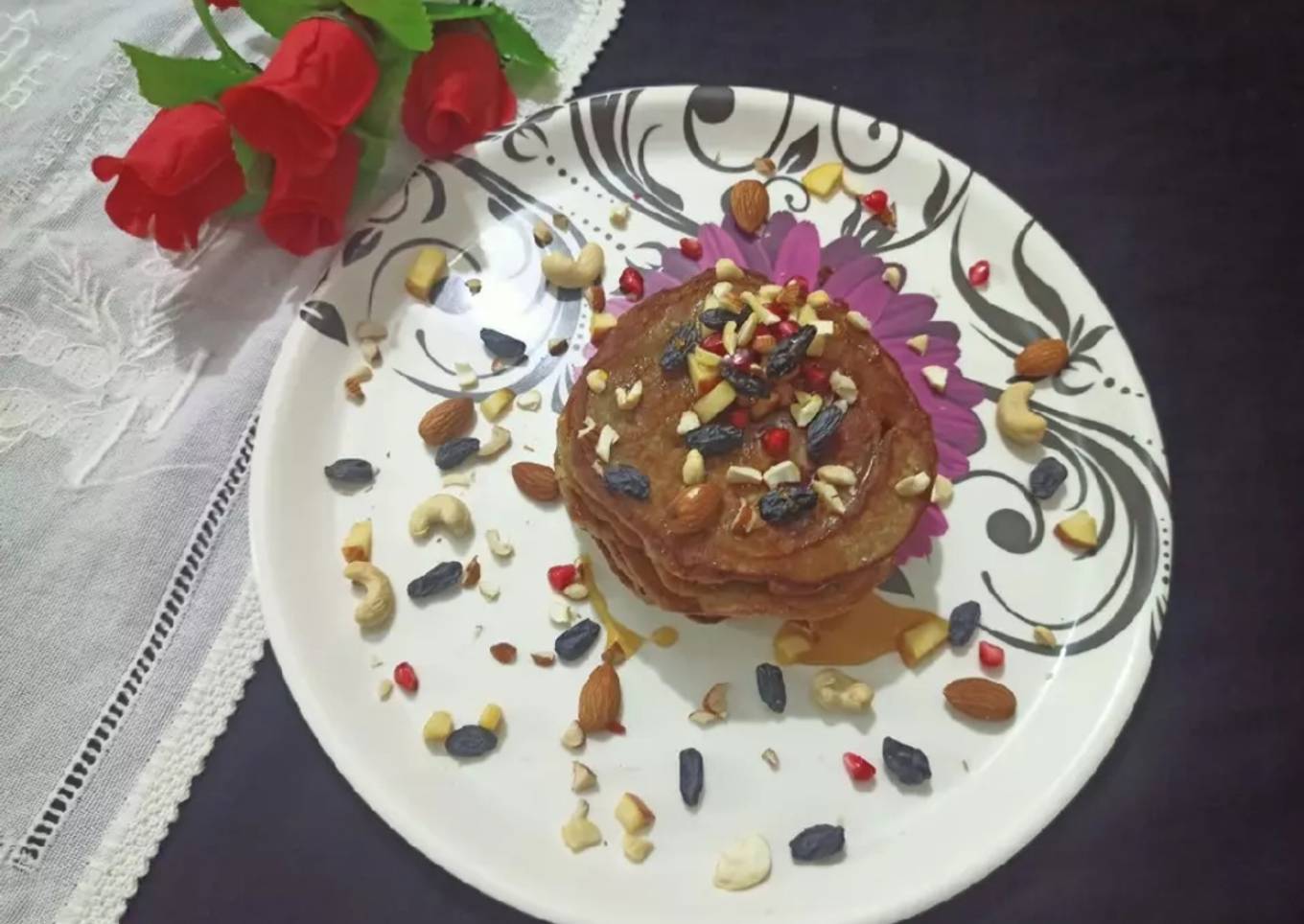 - Now our banana appam pancakes are ready to serve. Now place these pancakes in a serving plate. Place the pancakes on top. Garnish the pancakes with chopped apple pieces, pomegranate seeds, chopped banana pieces, dry fruits, dry black raisin and honey.