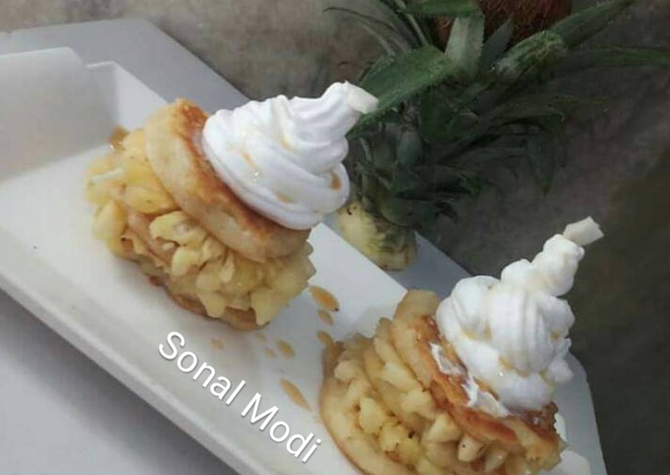 - Take a plate put 1st layer pancake, 2nd layer caramelized pineapple slice 3rd layer pancake, 4th layer caramelized pineapple,5th layer pancake top with whipped cream and drizzle maple syrup.