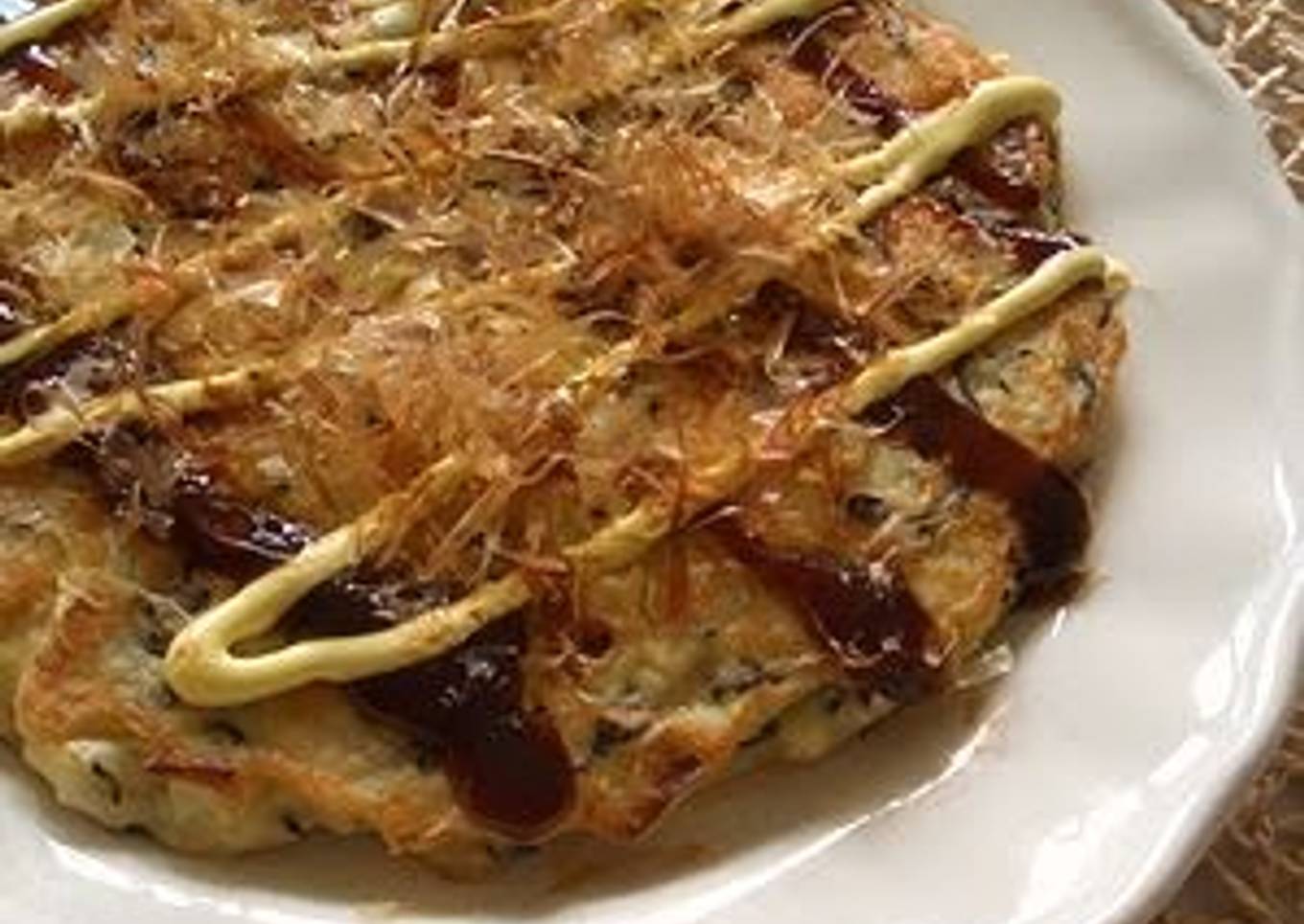 - Serve on a plate and squeeze mayonnaise and okonomiyaki sauce on top of it. Sprinkle bonito flakes on top to finish!