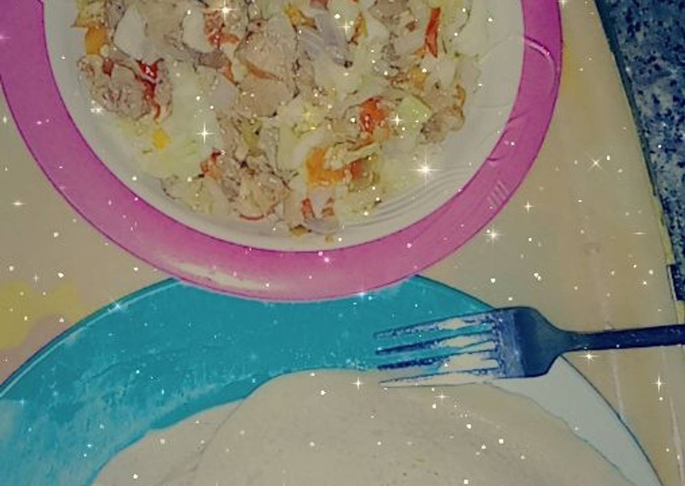 - For the sauce u sprinkle some oil the add your cabbage meat and pepper, continue mixing until its fried then u add ur seasoning to taste