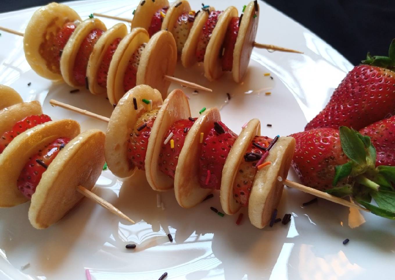 - Now take one pan cake and insert in stick then insert strawberry slice then pan cake...repeat this method and make all skewers..