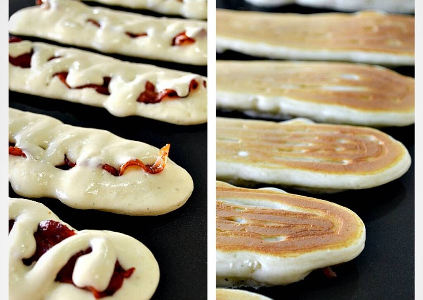 - Squeeze more batter over the bacon. This is to protect the bacon from the griddle when you turn that pancake dipper over.