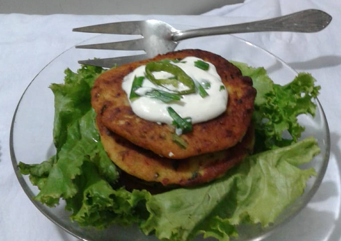- Ab serving dish ma neechay salad pata rakhye aur ab yeh pancake rakhye aur oper sour cream dalain