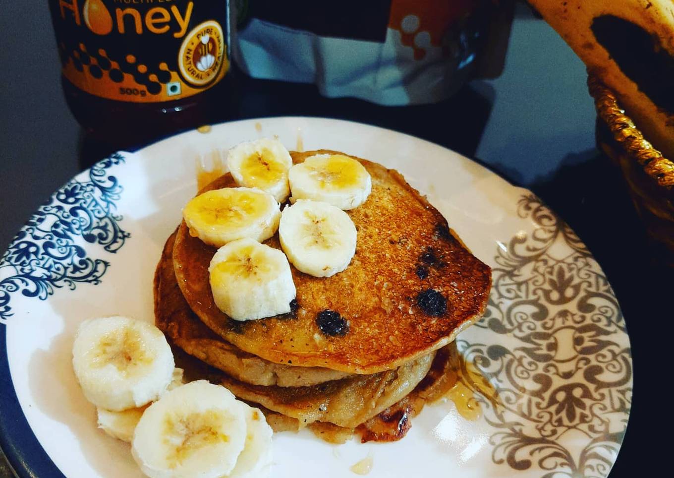 - Place it in a plate garnish some banana over the pancake and drizzle some honey