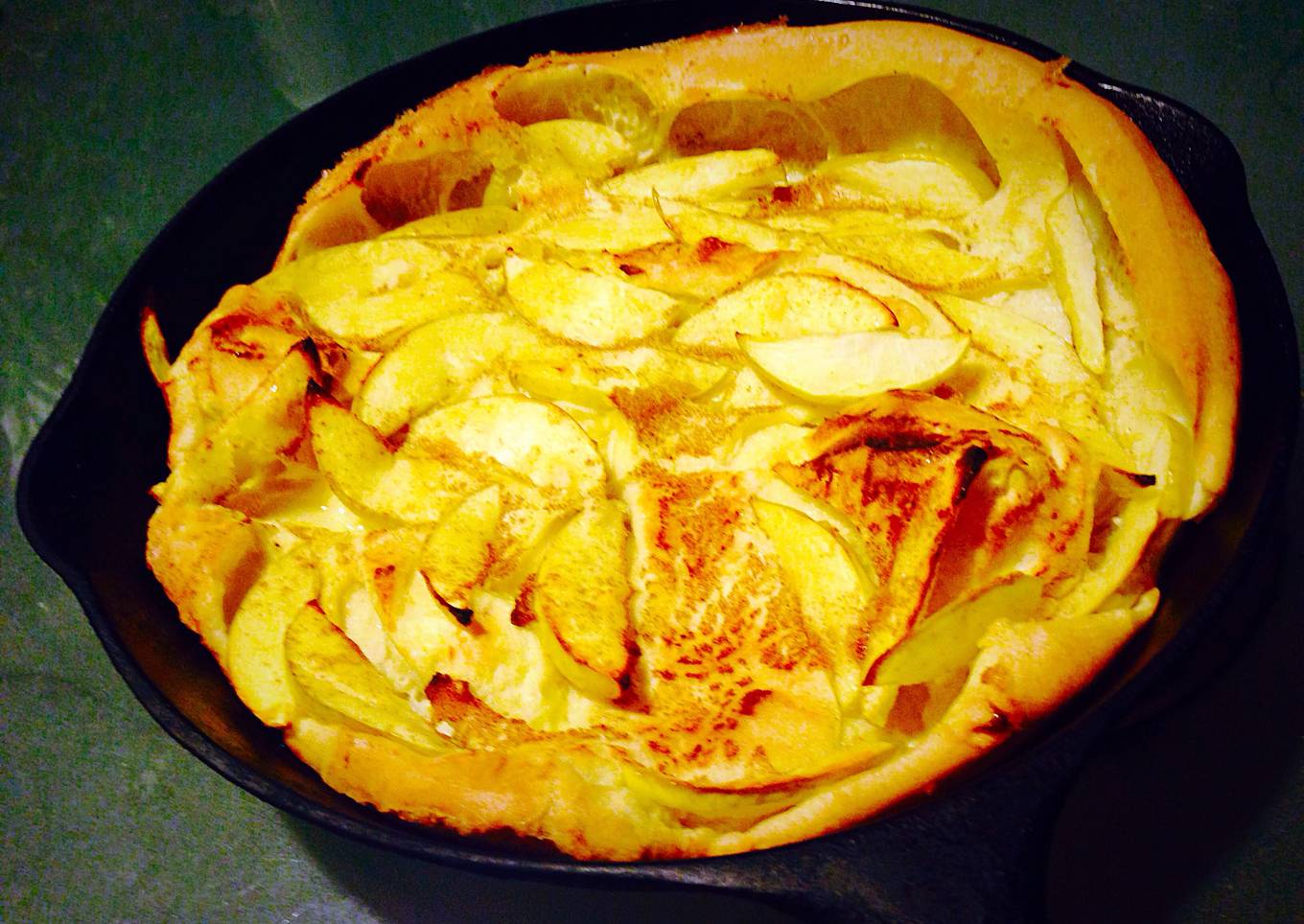 - Grease s cast iron skillet with the butter or oil. Add sliced Apple spread evenly. Top with batter. Sprinkle with cinnamon and sugar or honey drizzled. Bake 400 for 25 minutes