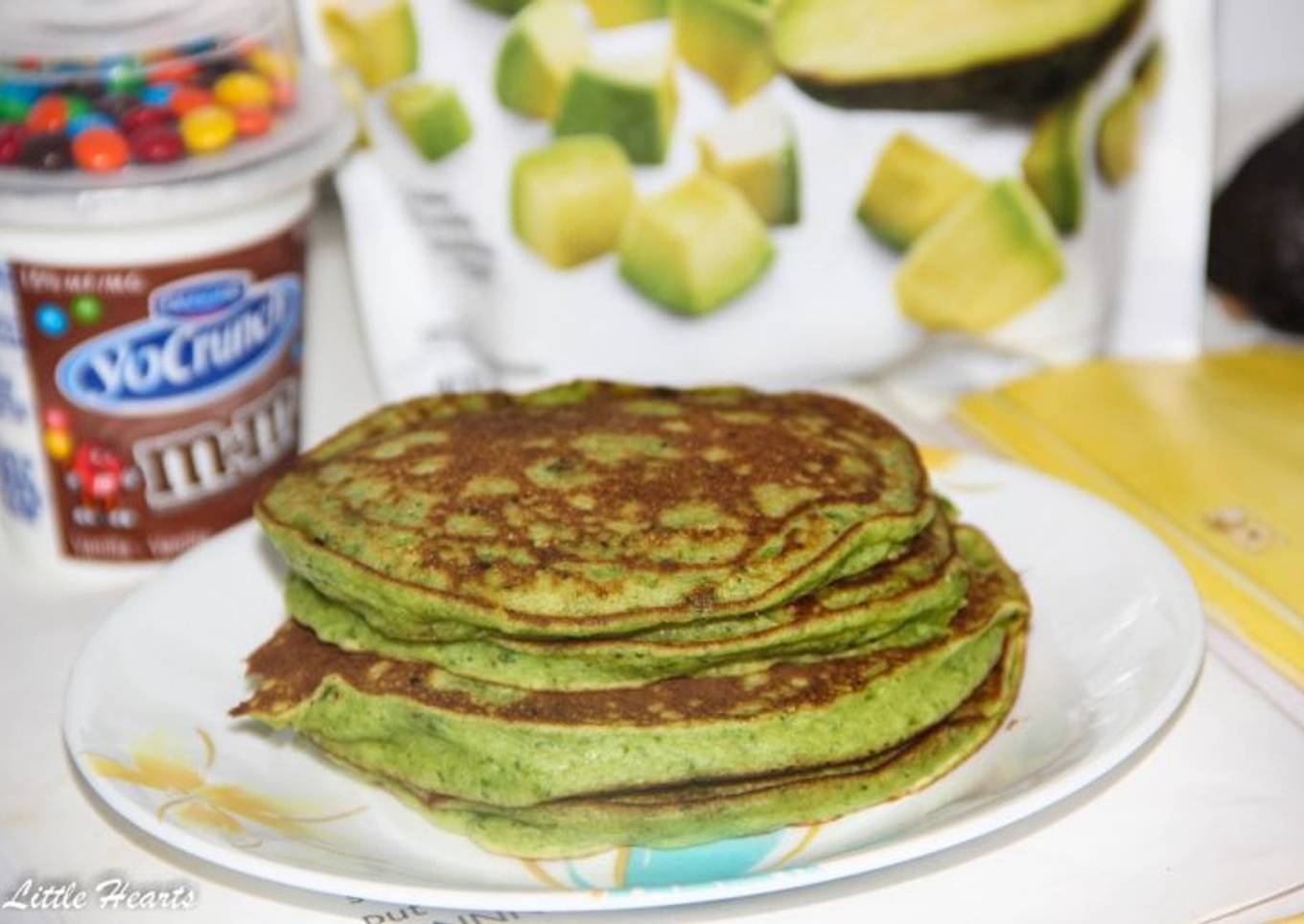 - Add avocado, spinach, milk and oats and in a blender and blend until smooth. Transfer it into a large bowl. Add the pancake mix, eggs, vanilla extract, green food colour, & honey and mix until combined. Heat a nonstick pan over medium flame.