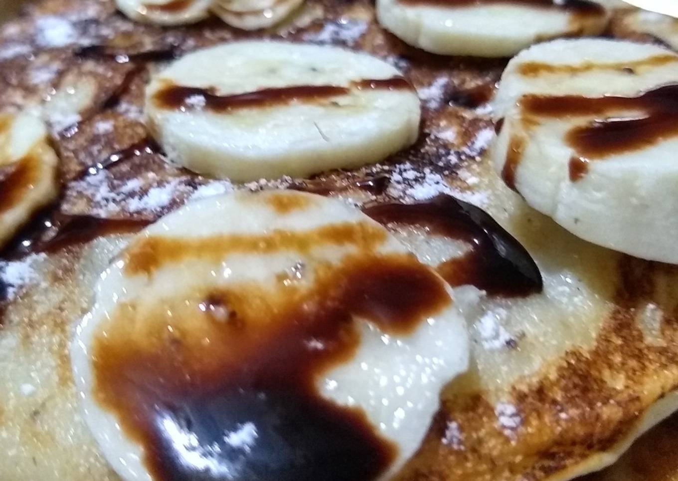 - Place the pancakes one on other, top it with chopped banana, sugar and chocolate syrup (optional)