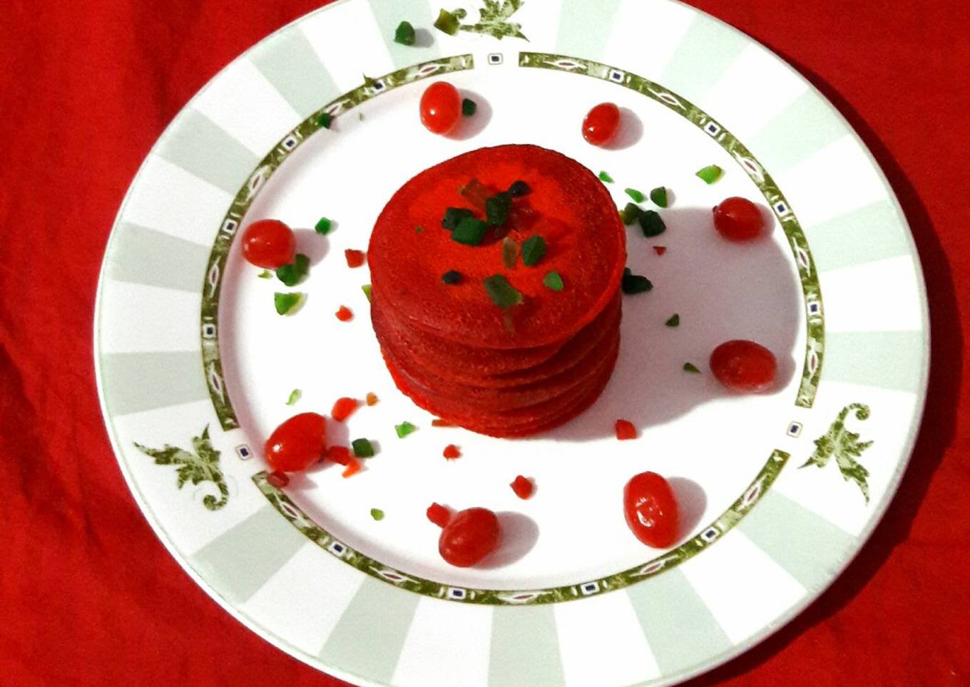 - Yummy eggless red velvet pancakes are ready.