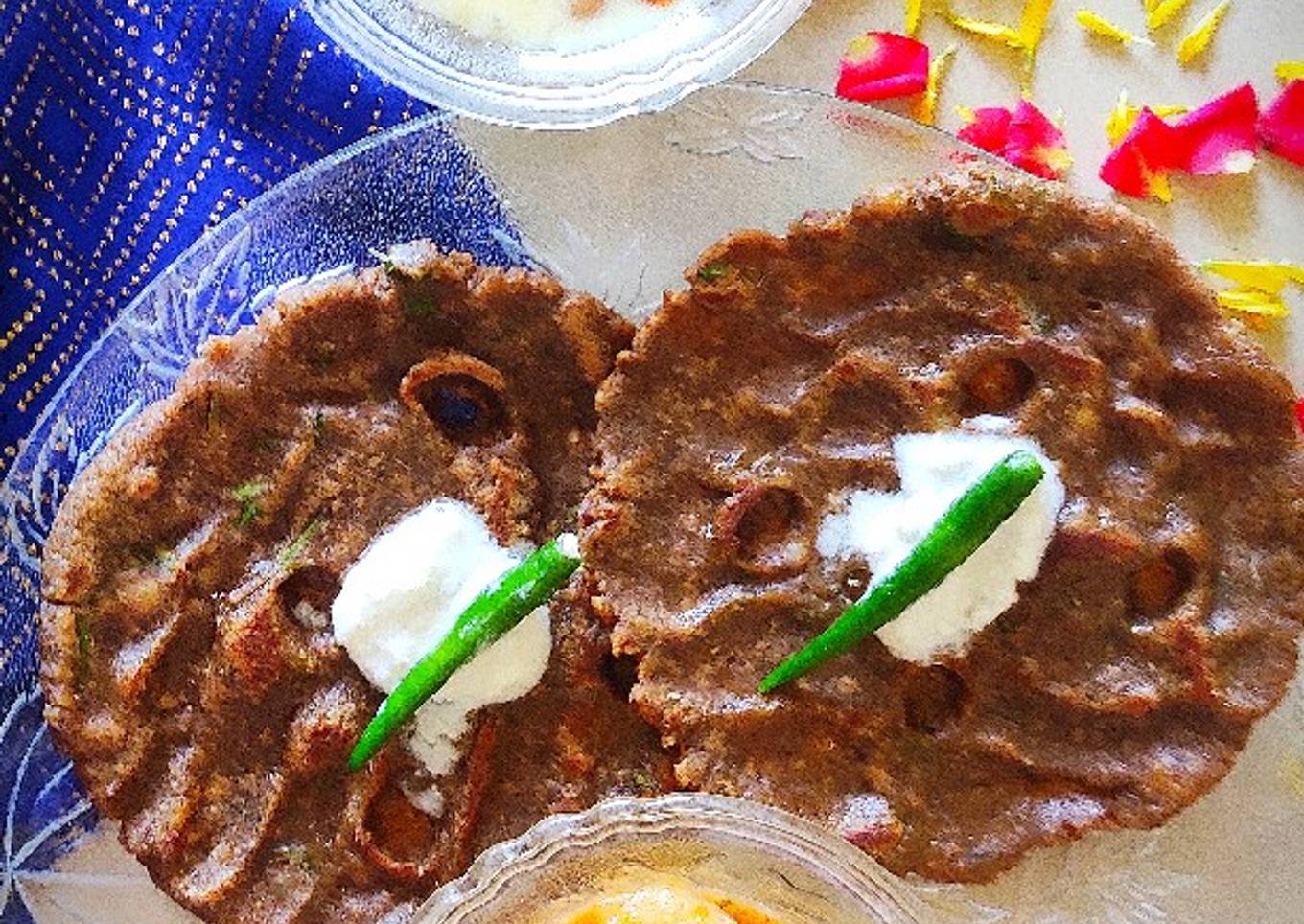 - Make 4 small indentations so that you can pour in drops of ghee in them to cook. Use 1 tsp ghee each side and cook covered from both side till crisp and brown.