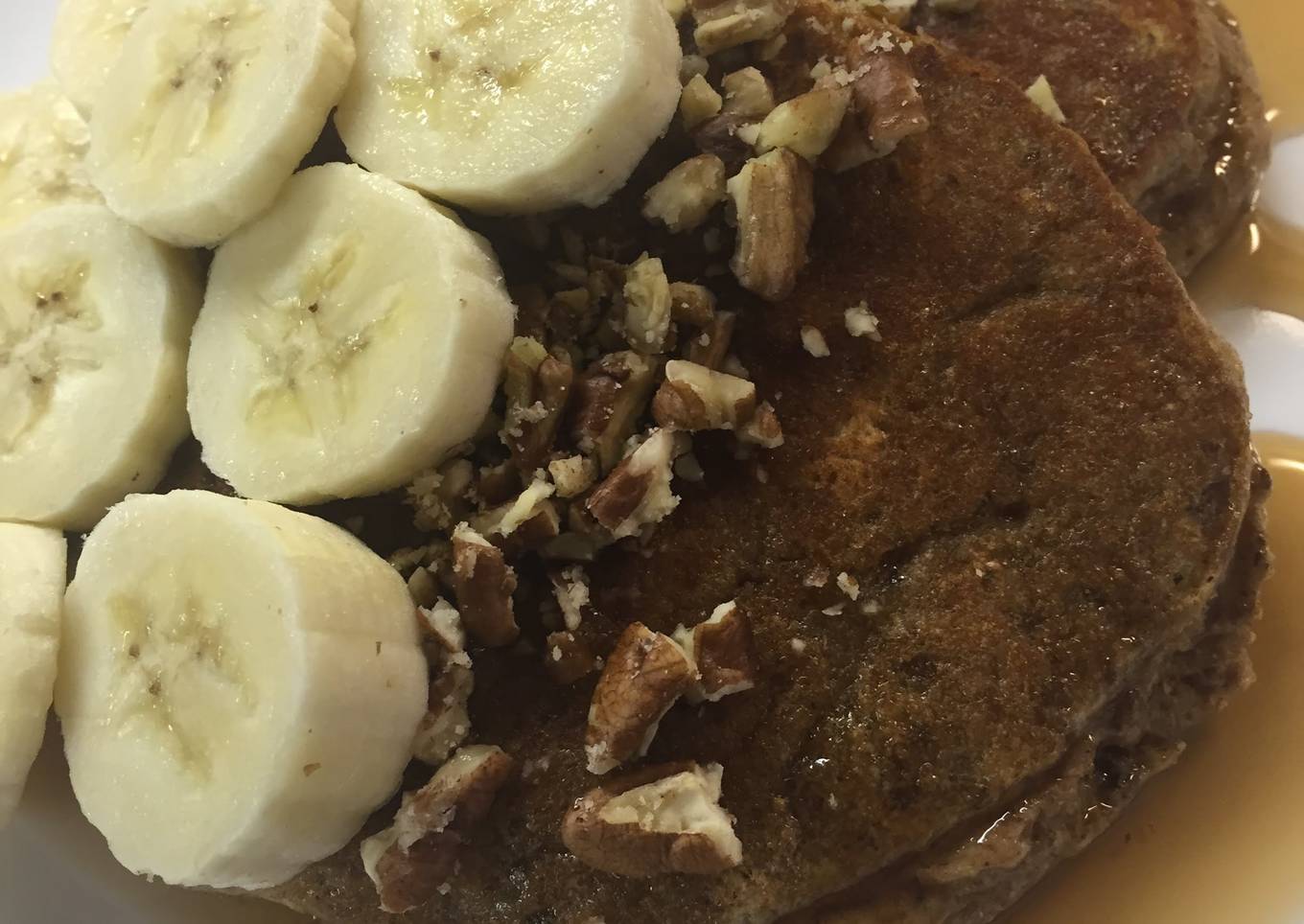 - Cook over low to medium heat for bout 2-3 minutes on each side til the pancake rises slightly and forms bubbles and is golden brown. Top with cut fresh bananas, syrup and pecans. Enjoy!