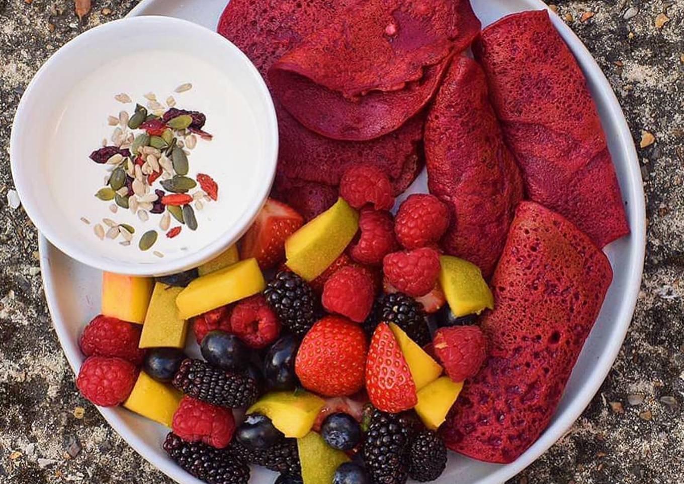 Instructions to make Beetroot pancakes with berries, mango with vegan yoghurt+seeds